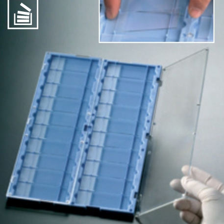 Fabricada en poliestireno de alto impacto, puede contener 20 portaobjetos estándar.