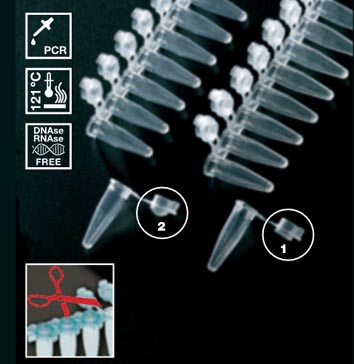 Tiras (1) de 8 tubos de 0,2ml y tiras de 12 tapones unidos planos perforables, 125 tiras