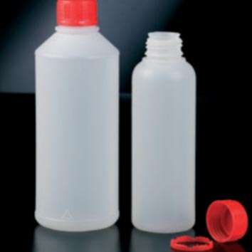 Botellas cilíndricas translúcidas, fabricadas en polietileno alta densidad de color natural, con tapón precinto de color rojo.
