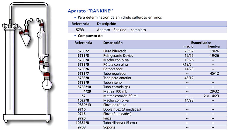 Aparato de Rankine para determinación de anhídrido sulfuroso en vinos Completo con soporte. Para determinación de anhídrido sulfuroso en vinos. Referencia: 5733AF Marca: Afora « Volver