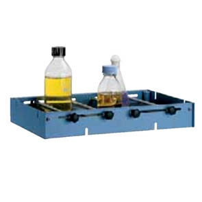 Plataforma universal con superficie antideslizante, con cuatro barras de sujeción recubiertas de silicona que permiten sujetar toda clase de vasos, Erlenmeyers, matraces, frascos, etc.