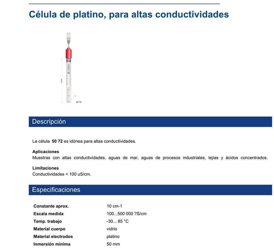 Célula para altas CE, con electrodos de Pt, cuerpo vidrio y temperatura