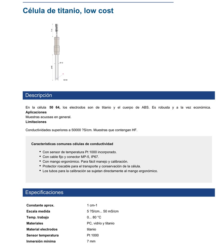 En la célula 50 64, los electrodos son de titanio y el cuerpo de ABS. Es robusta y a la vez económica.