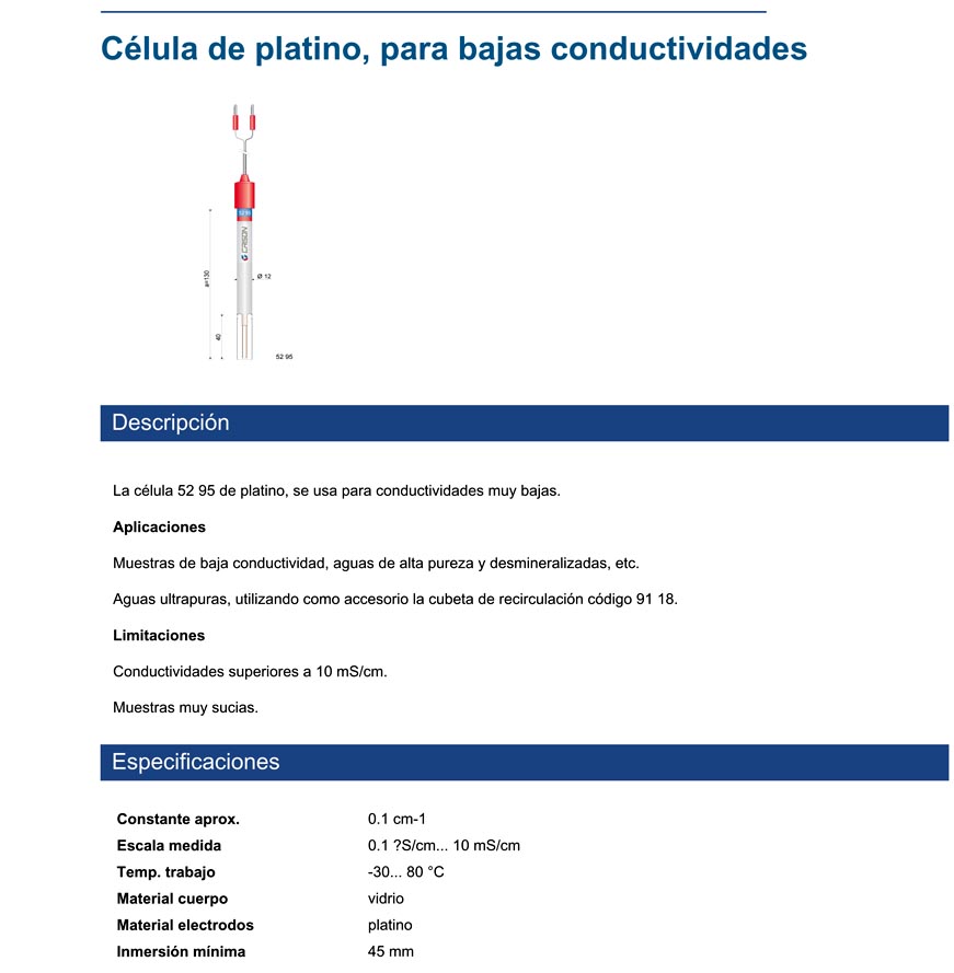La célula 52 95 de platino, se usa para conductividades muy bajas.