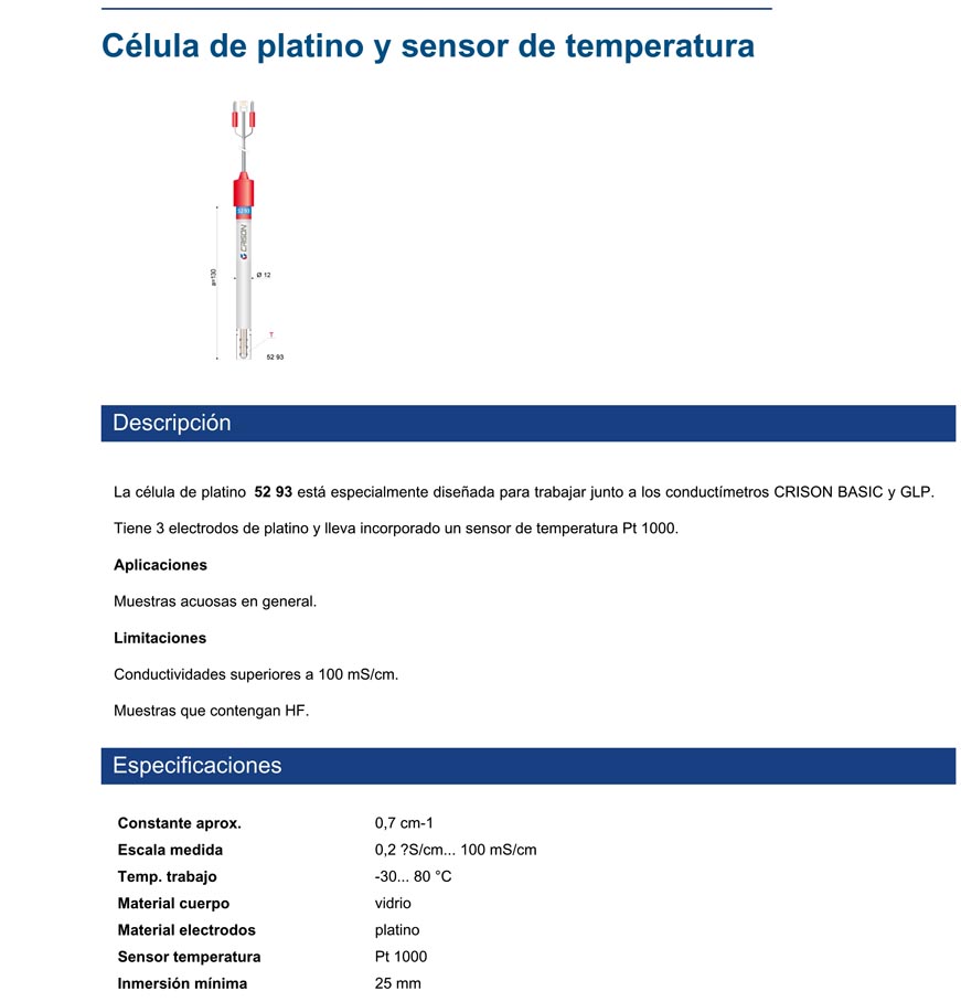 La célula de platino 52 93 está especialmente diseñada para trabajar junto a los conductímetros CRISON BASIC y GLP. Tiene 3 electrodos de platino y lleva incorporado un sensor de temperatura Pt 1000.