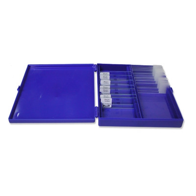 Caja plástico para 100 portaobjetos, apertura con bisagra, ranuras numeradas Fabricadas en plástico ABS azul. Para portas estándar 76x26mm. Puede ser apilada. Apertura con bisagra, ranuras numeradas del 1 al 100. Capacidad 100 portas. Dimensiones 210x163x30mm. Referencia: 40305450 Marca: Deltalab « Volver